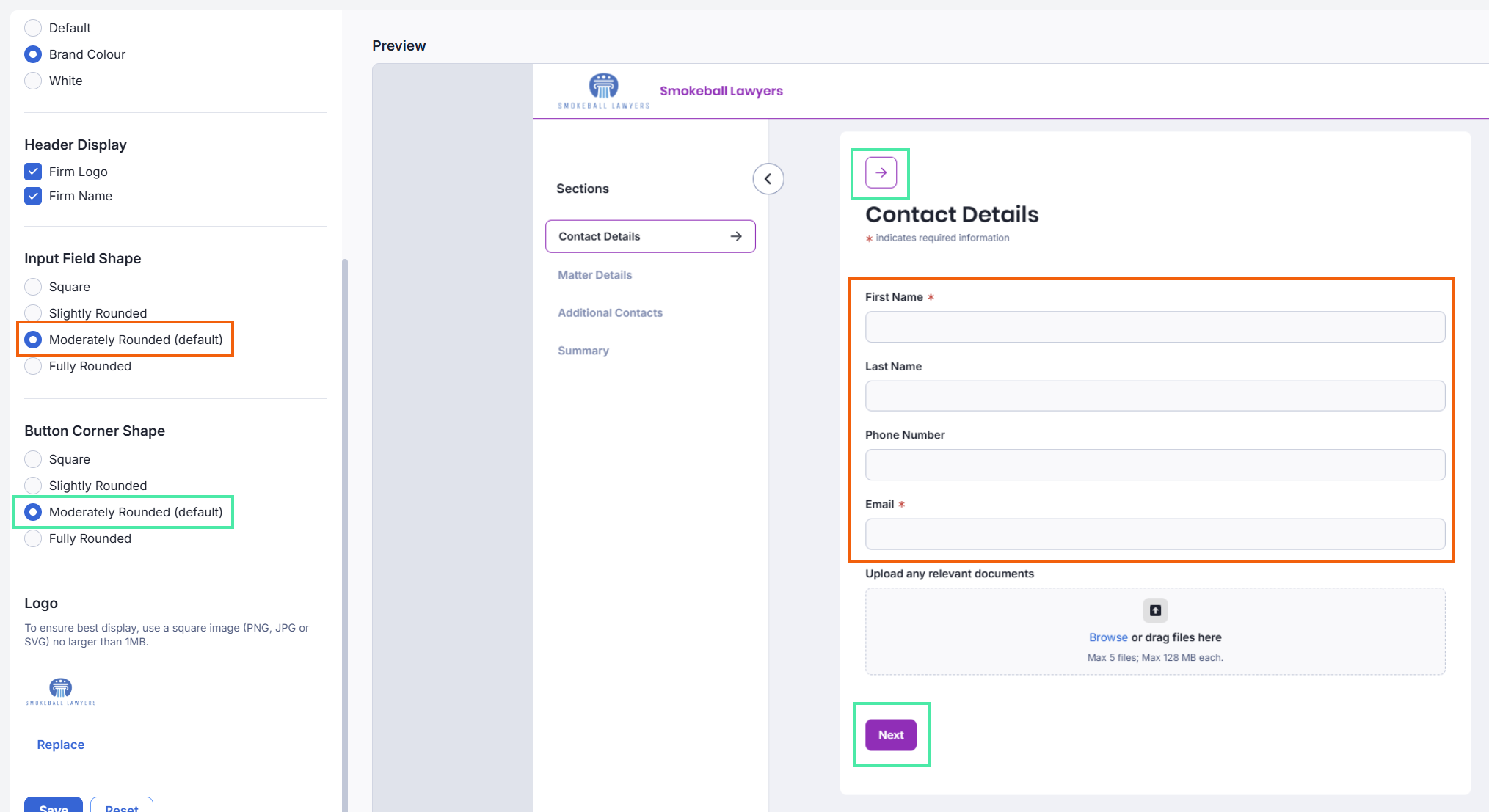 There are four shapes you can choose from when customising your Input Fields (i.e. the fields where the client will enter information) and Buttons: