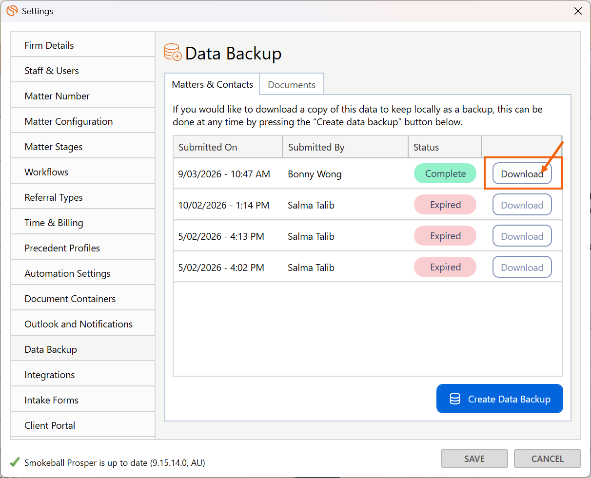 The Smokeball Settings Data Backup tool to back up Matters and Contacts has been updated: