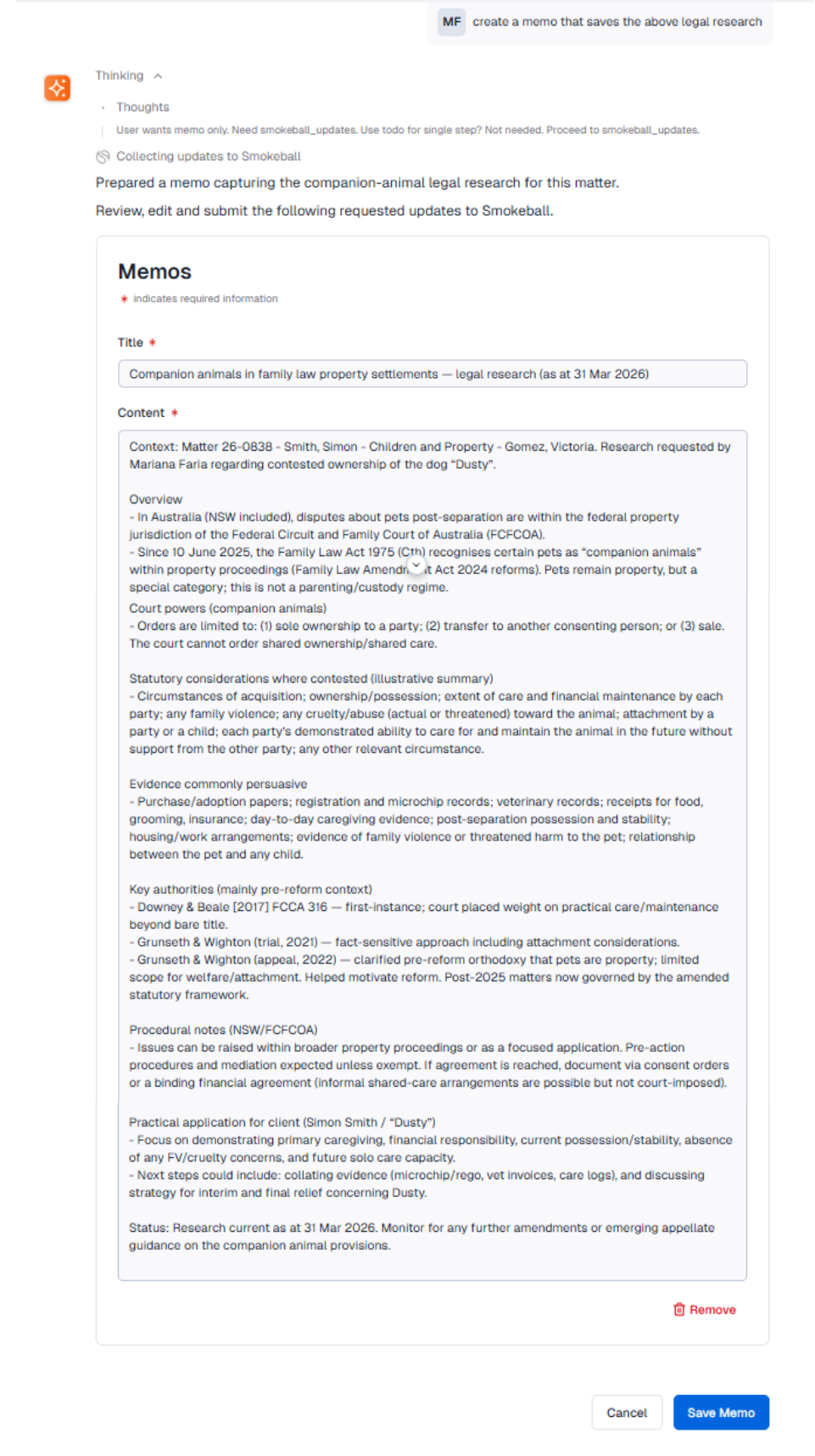 If you have been using Archie for matter research, you can ask it to capture your work in a memo. You have the opportunity to edit the memo before saving it to the matter.