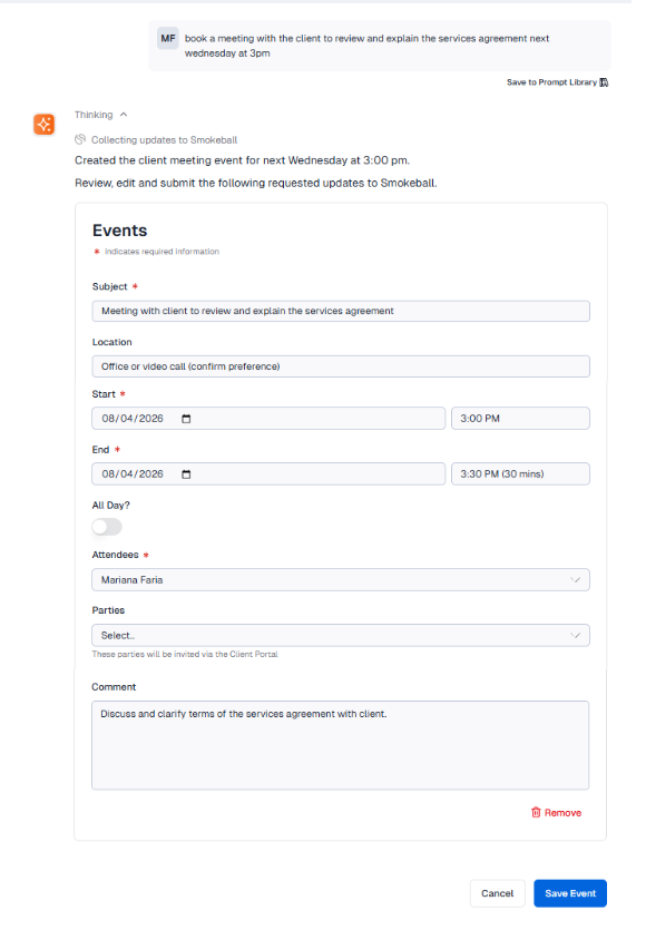 Archie can draft an event for your Smokeball calendar when asked, saving you the time needed to create one from scratch. It understands that phrases like "Create an event..." and "Book a meeting..." are prompts to draft an event.Â