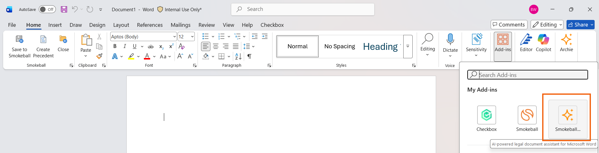 Select Add-ins again on the Word ribbon and click on Smokeball Archie.