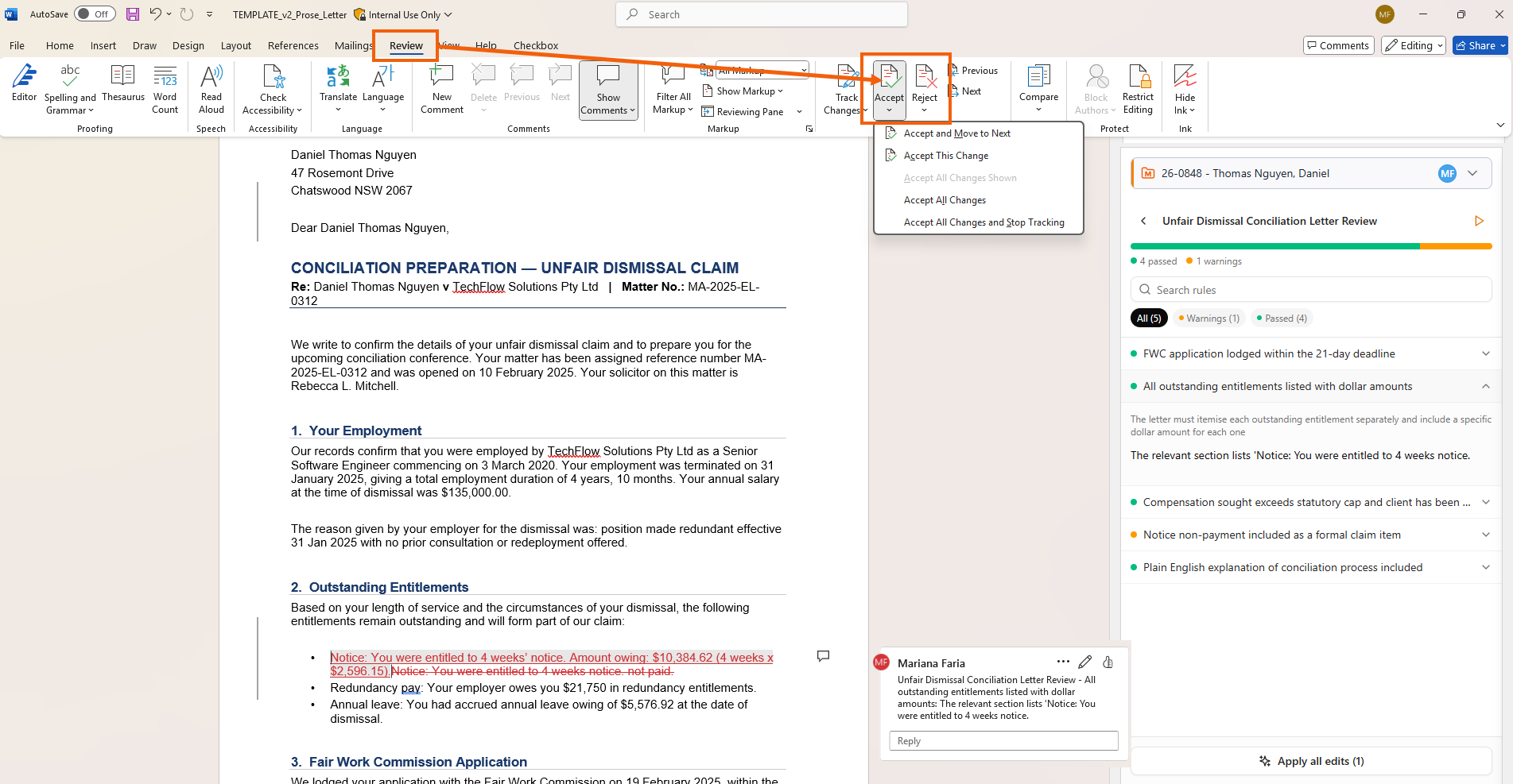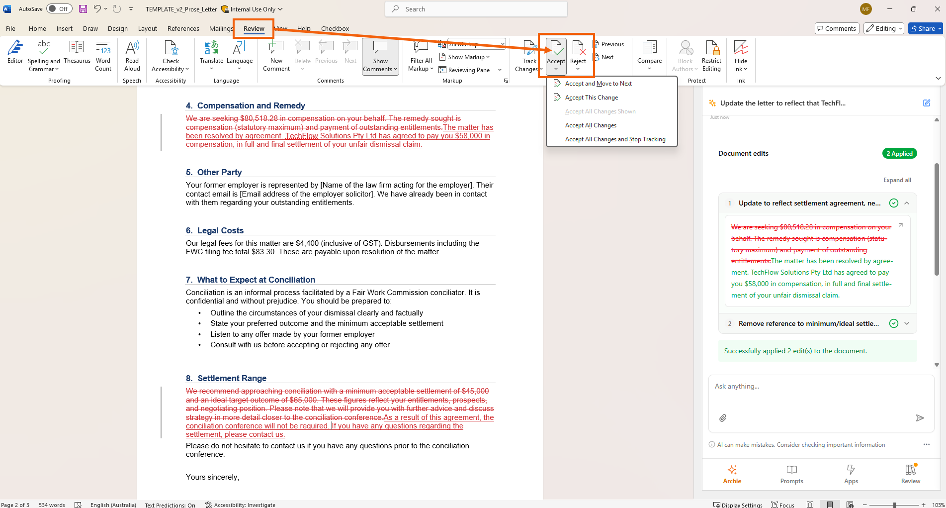Selecting Apply Edit/Apply all edits will appear as an Archie document edit for a final check before it replaces text. Navigate to the Word Ribbon > Review > Accept/Reject to finalise changes.