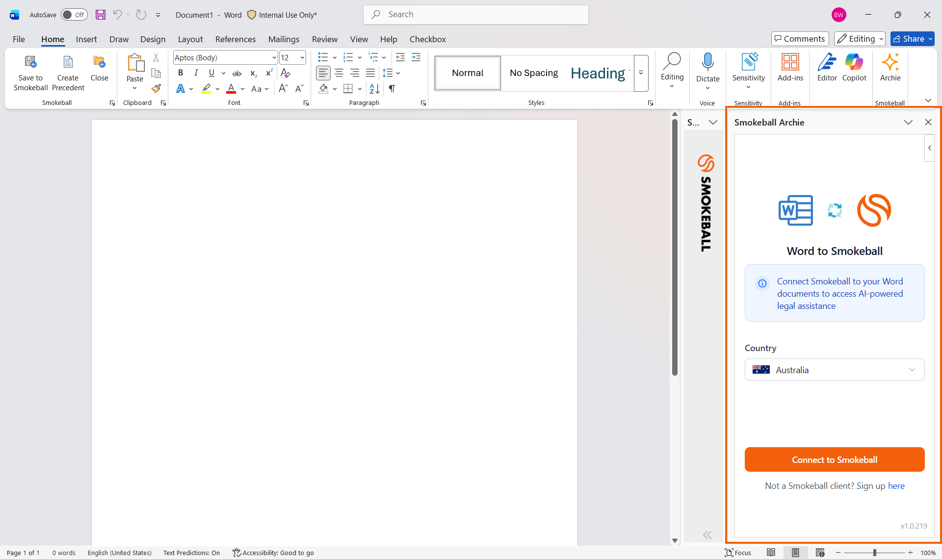 The Archie Word add-in will appear on the right-hand side of Word. Log in with your Smokeball email, password and 2FA code when prompted.