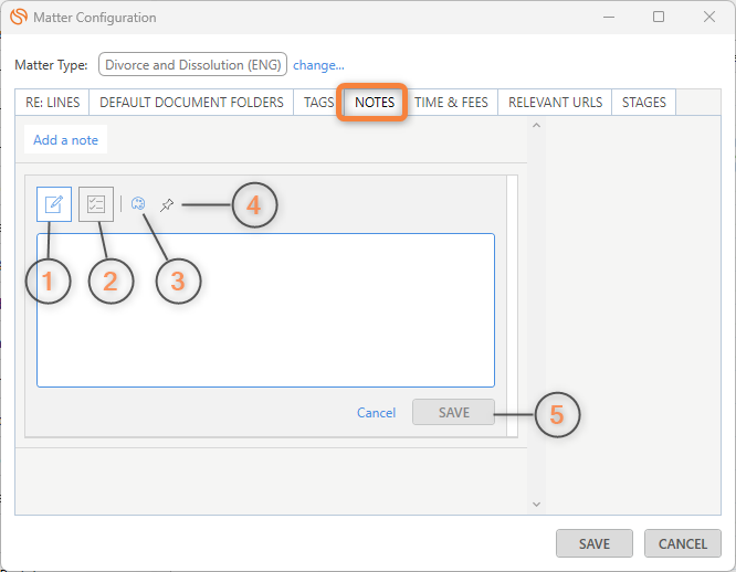 - Select Add a note under the Notes tab of Matter Configuration