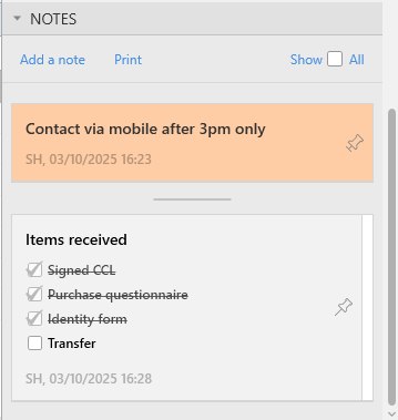 Notes are post-it notes on your matter. They can be used as a quick reminder or as a checklist of items. Notes can be printed later. Notes should not be used as a "to-do" check list as Tasks & Workflows are the better feature to use. You can create default Notes in Matter Configuration.