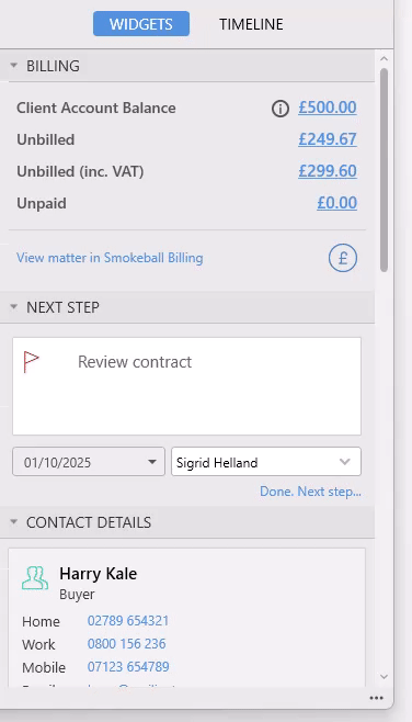 When a contact is selected in Matter Details, the Contact Details Widget gives additional information about the contact without having to open the contact card.