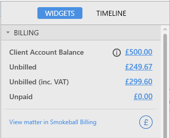 The Billing widget shows a high-level view of balances in Smokeball Billing including Client Account balance, Unbilled, and Unpaid balances. If a user has been disabled from accessing financial information in Smokeball Staff & User Settings, this Widget is unavailable to them.