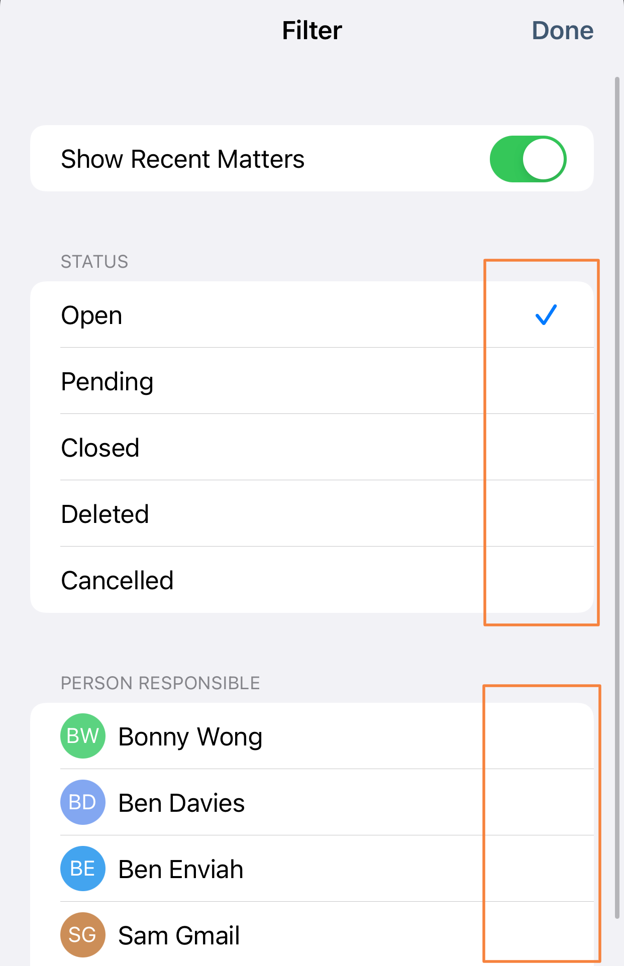 Then, tick the statuses and persons responsible you wish to see and select Done.