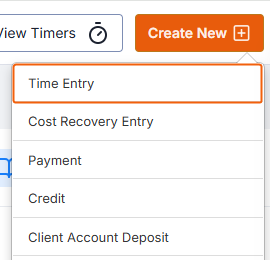 Note: You can also access the Time/Fee Entry window by selecting the Create New button in the top right of the web app screen and then selecting Time Entry. Any entries created here must be assigned to a matter before saving.