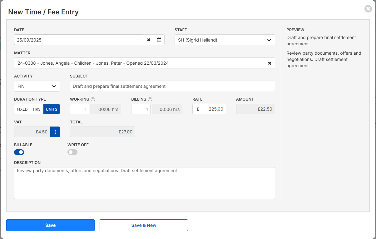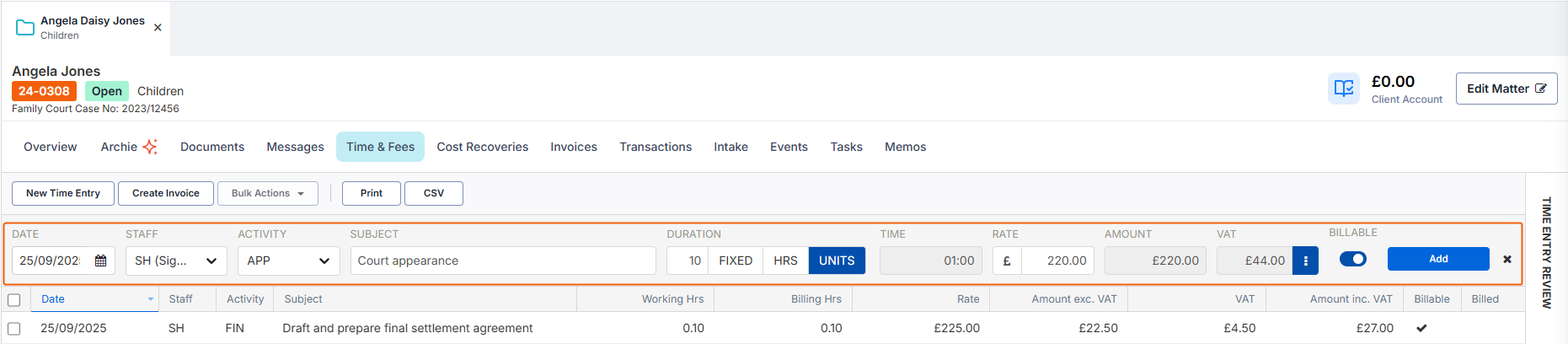 Learn how to enter time and fixed fee entries in Smokeball to keep track of billable and fixed work.