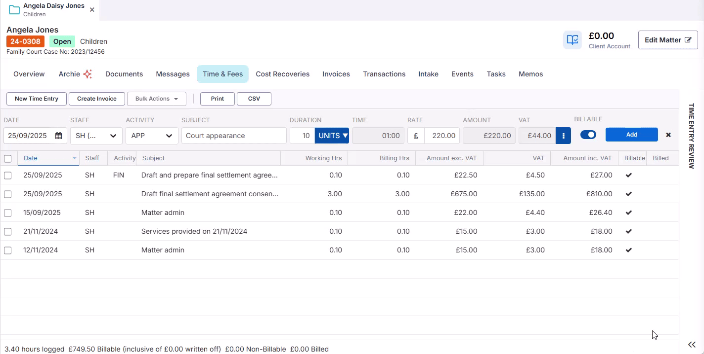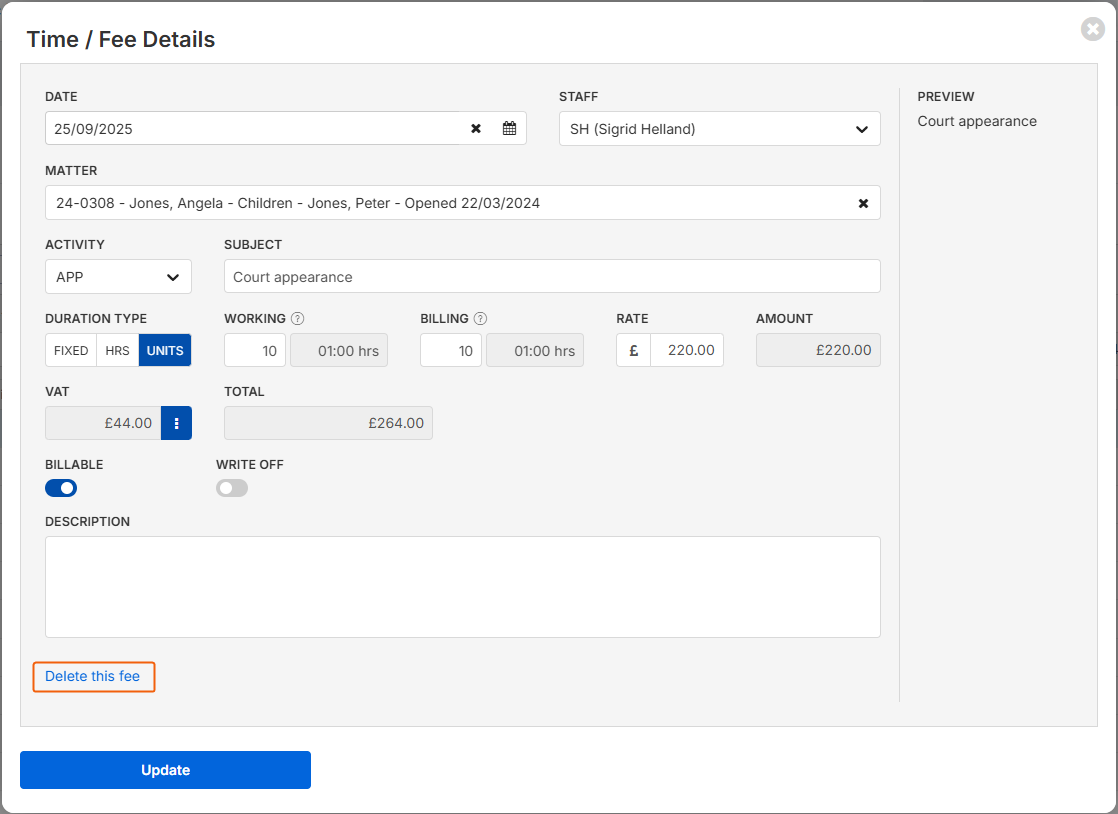 - You cannot delete a time/fee entry that is already associated with a finalised invoice.