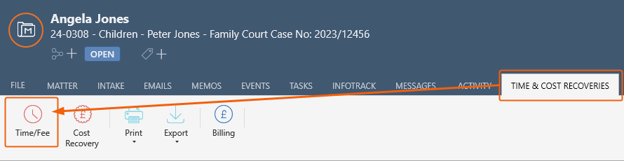 - Select an existing matter, then select the Time & Cost Recoveries tab.