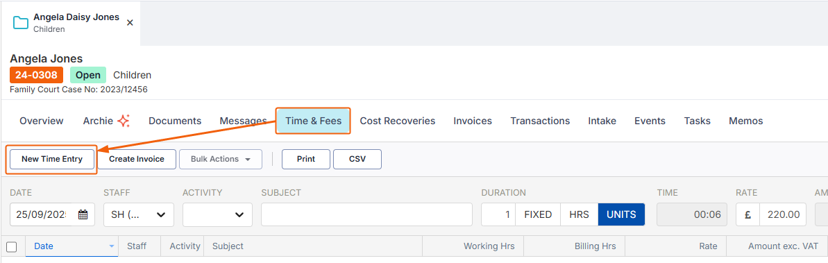 - Open a matter, then select New Time Entry from the top-left corner of the Time & Fees tab. This will open the New Time/Fee Entry dialogue box.