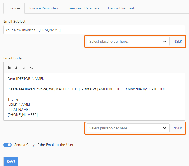 You can change the subject line and body text of the invoice, invoice reminder, and evergreen retainer emails sent from Smokeball.