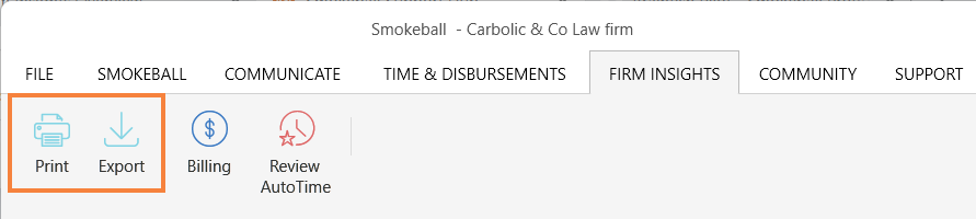 You can print or export the report to a .CSV file on the top-left corner of Firm Insights or Matter Insights.