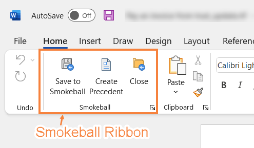 When working on a Word document that needs to be saved to a Smokeball matter, make sure you are saving your document using the integrated ribbon. By default, the ribbon is located in the upper left corner of Word.