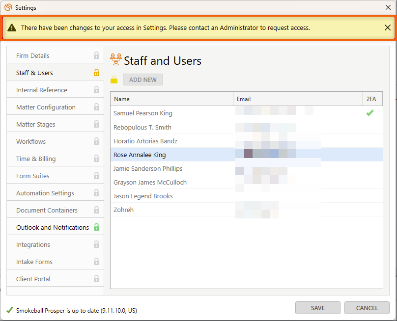 When this permission level is applied, the only areas the staff member can access in Smokeball Settings are: