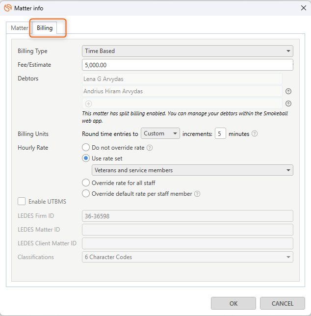 - Your onboarding specialist helped you configure your default matter billing rate under Smokeball Settings. However, billing rates can change at any time and may need to be overridden on an individual file.