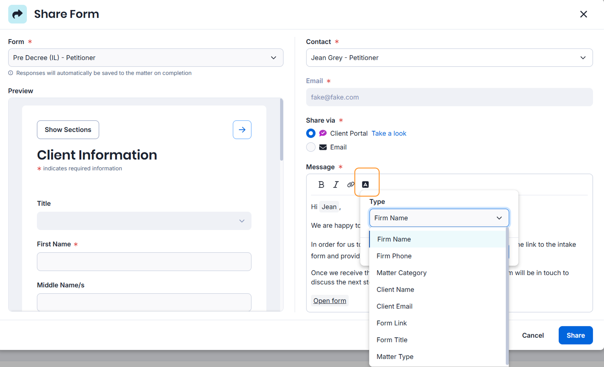 The Form Preview window will automatically populate fields with information from the matter details if they have been filled in. - Choose whether you wish to send this form via Communicate or email. Edit the message if needed.