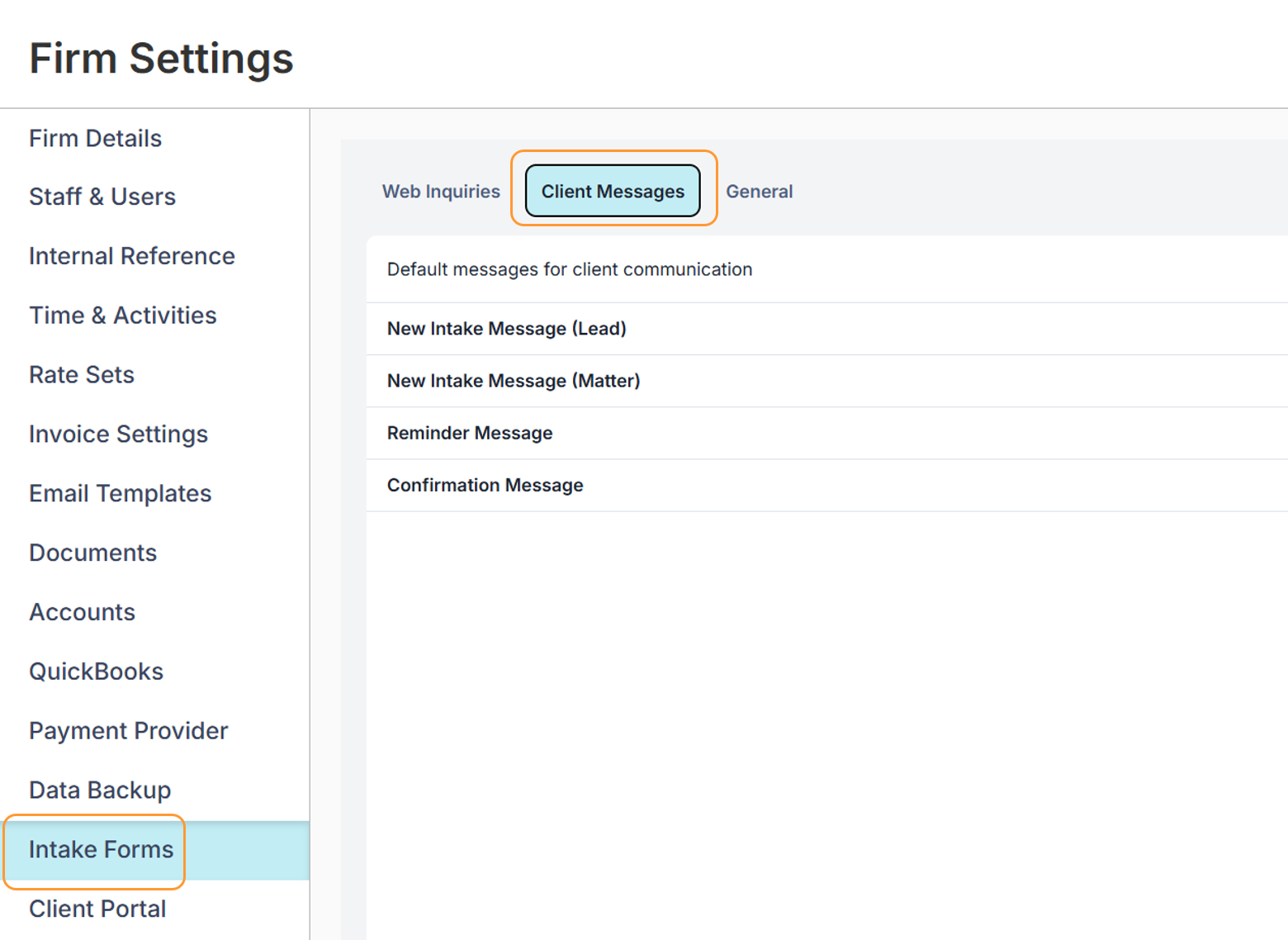 - You can customize this message for all matters or leads in Settings > Firm Settings Intake Forms > Client Messages.