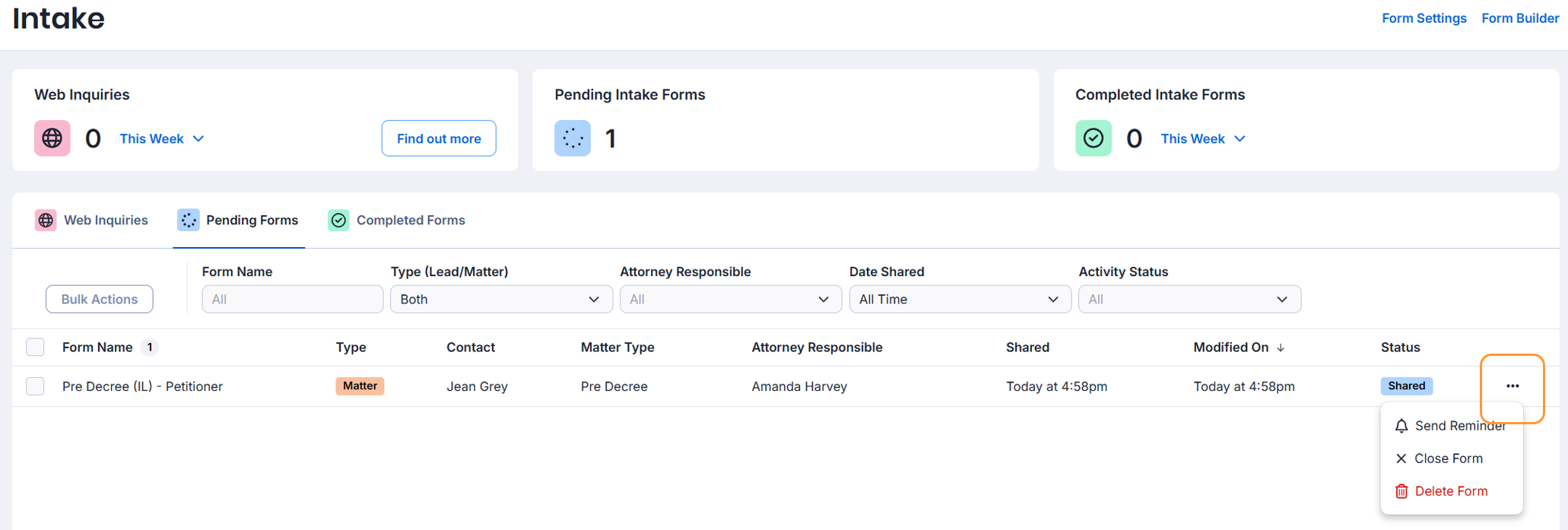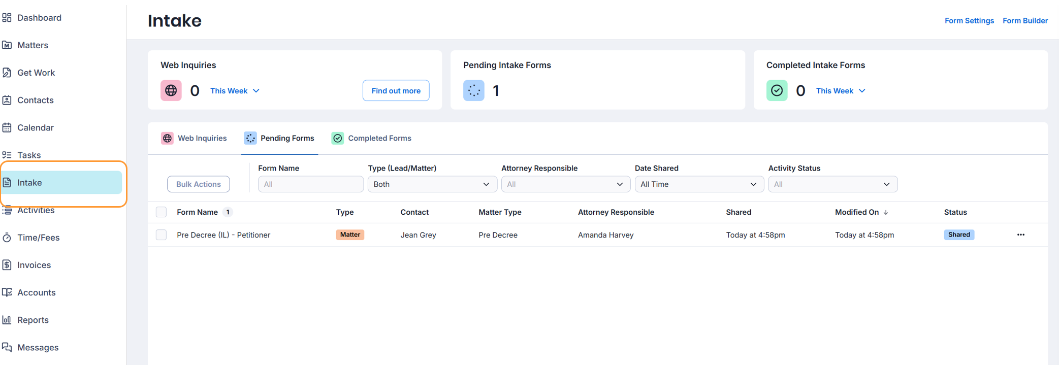Navigate to your global Intake tab to view the progress of intake forms across all your matters or leads. It can be configured to display a number of all forms or a list of forms.