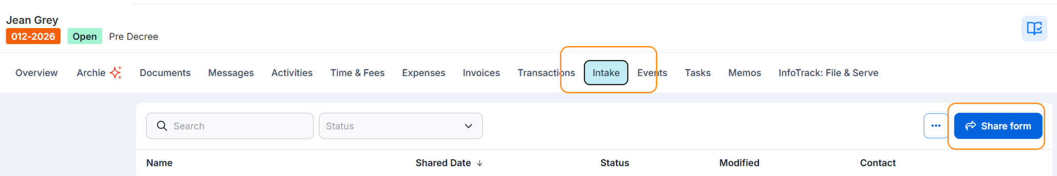 - Open the matter or lead and select the Intake Forms tab.