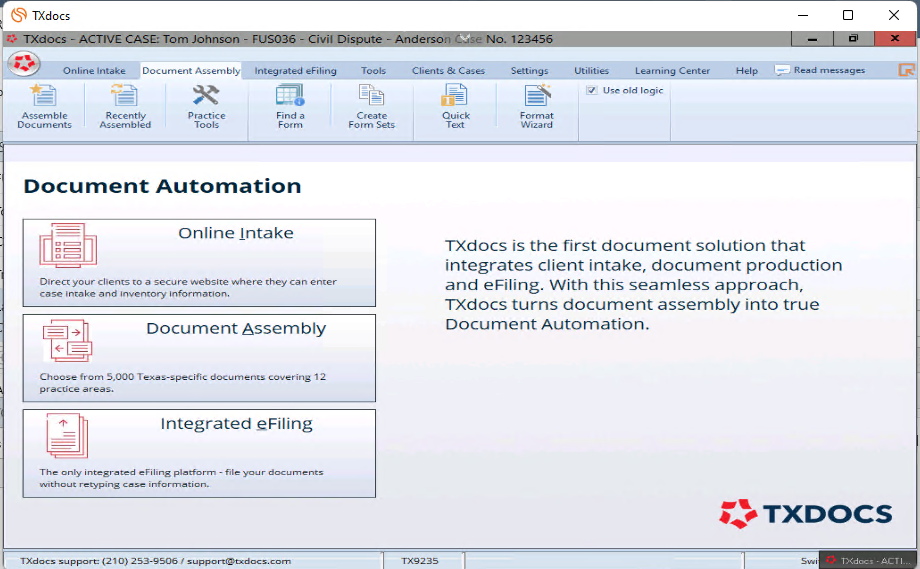 - Each matter with Texas designated as the jurisdiction will have a TXdocs button on its action bar.