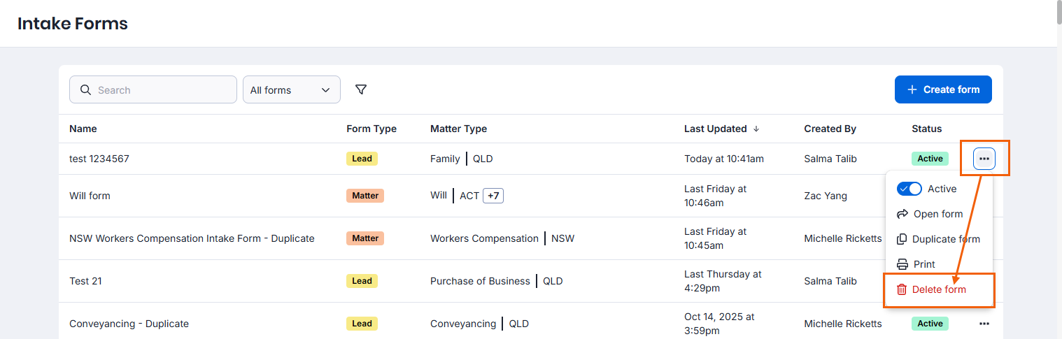 You can also search and filter matter and lead intake forms. Use the blue pin icon to add and remove filters for the state, matter type, and creator of the forms.