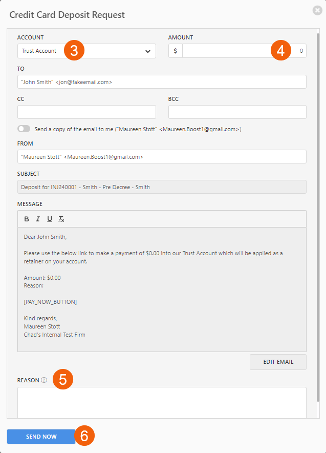 The Smokeball Payments link to pay into the account you chose in Step 3 will be added to the email after you select Send Now.