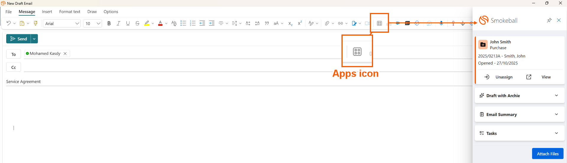 - Select Apps from the toolbar, then select Smokeball for Outlook again to display the Smokeball toolbar. This is where you can view the matter that this email will save to, and also attach any files from the matter to your email.