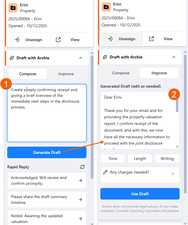 - If you have the Archie add-in, use Draft with Archie to enter a prompt for Archie AI to work with when generating a draft email.