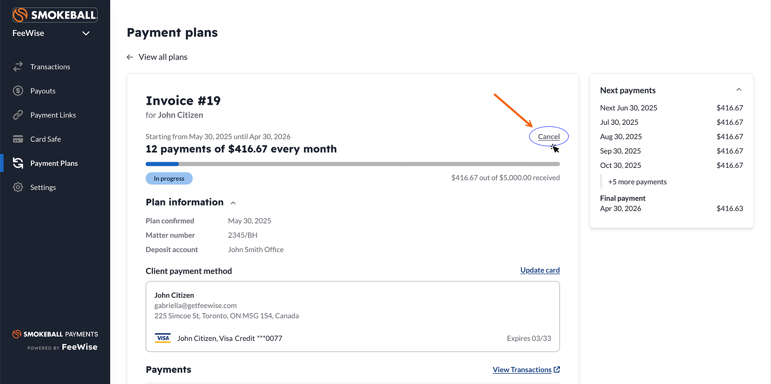 As of July 1, 2025, you will need to create and manage payment plans through the Smokeball web app instead of the Smokeball Payments portal.