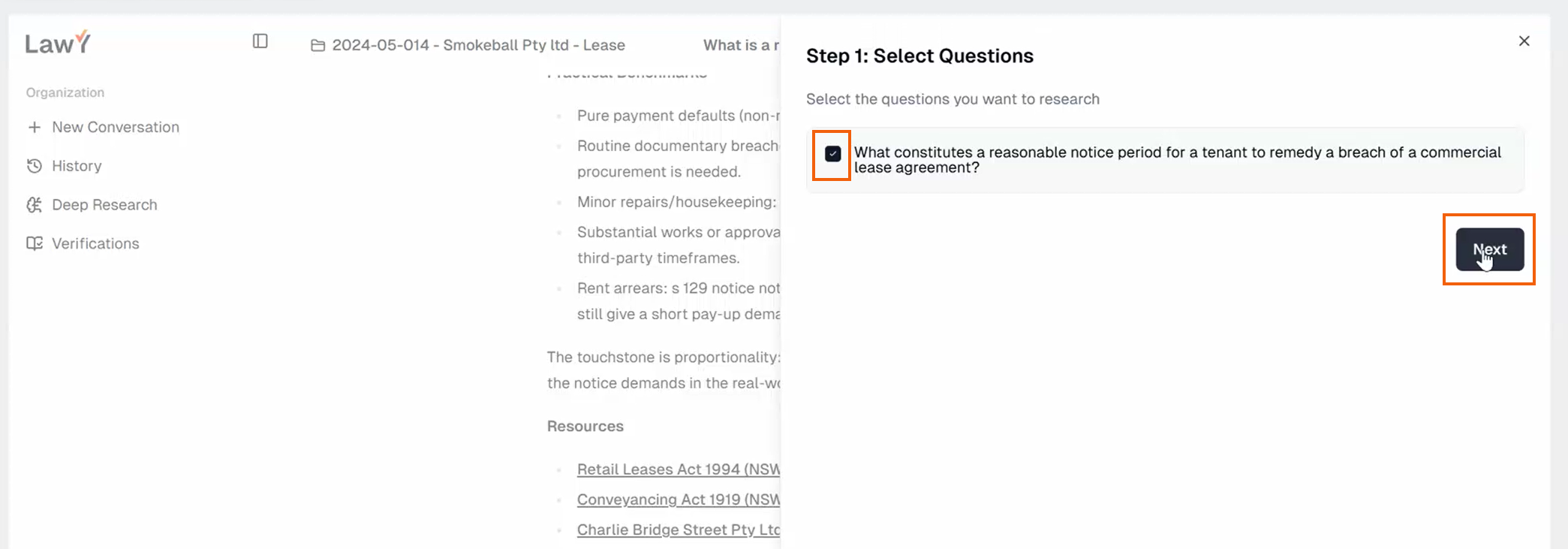 A panel will open from the right-hand-side of the screen, where LawY will display recommended follow-up questions. Tick the questions you want to research, then select Next.