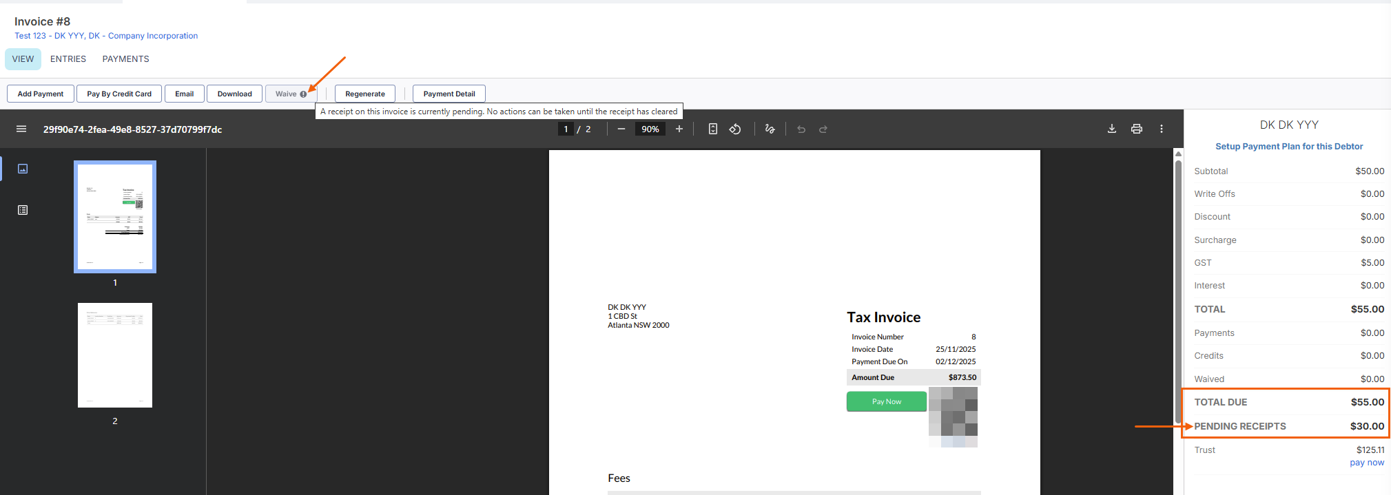 When there is a pending payment for a partial amount of the invoice, the Waive button will be disabled, and the debtor can only pay the remaining balance of the invoice.