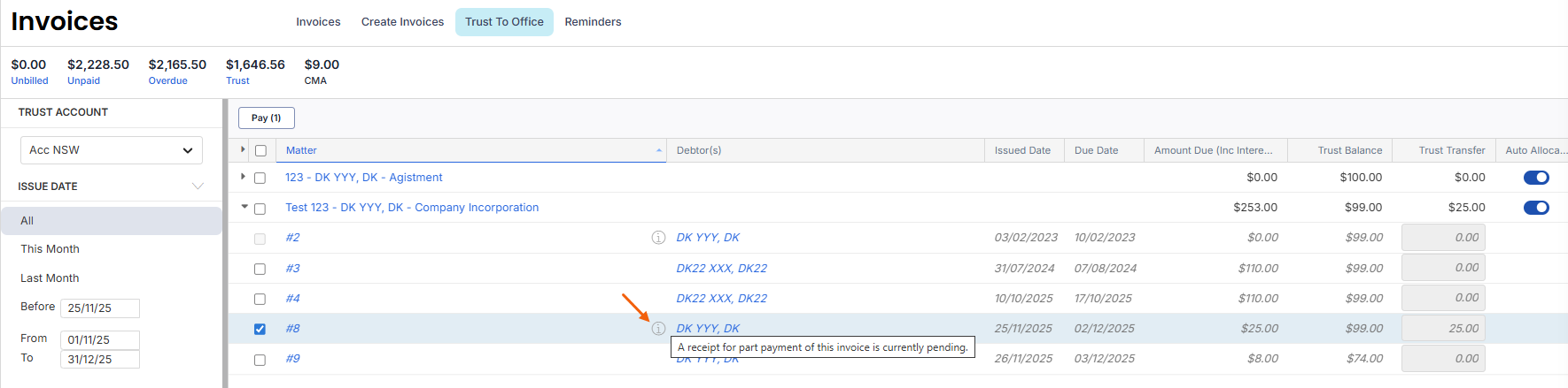 Invoices with part pending receipts will show and allow for the remaining balance to be paid.