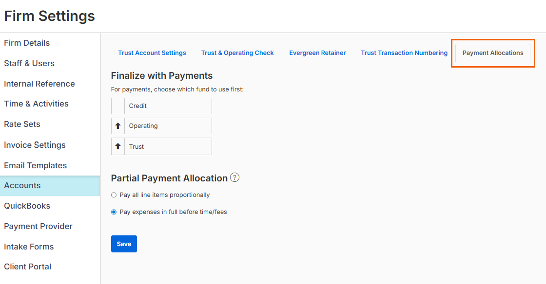 - Choose the Partial Payment Allocation relevant to your firm: