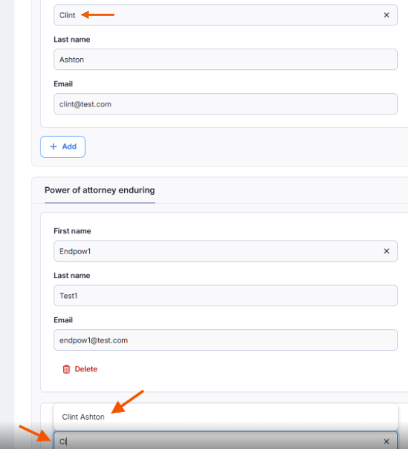 If a person’s contact details have already been entered in an Intake Form, typing the first two letters of their name will allow the respondent to reuse those details instead of entering them again.