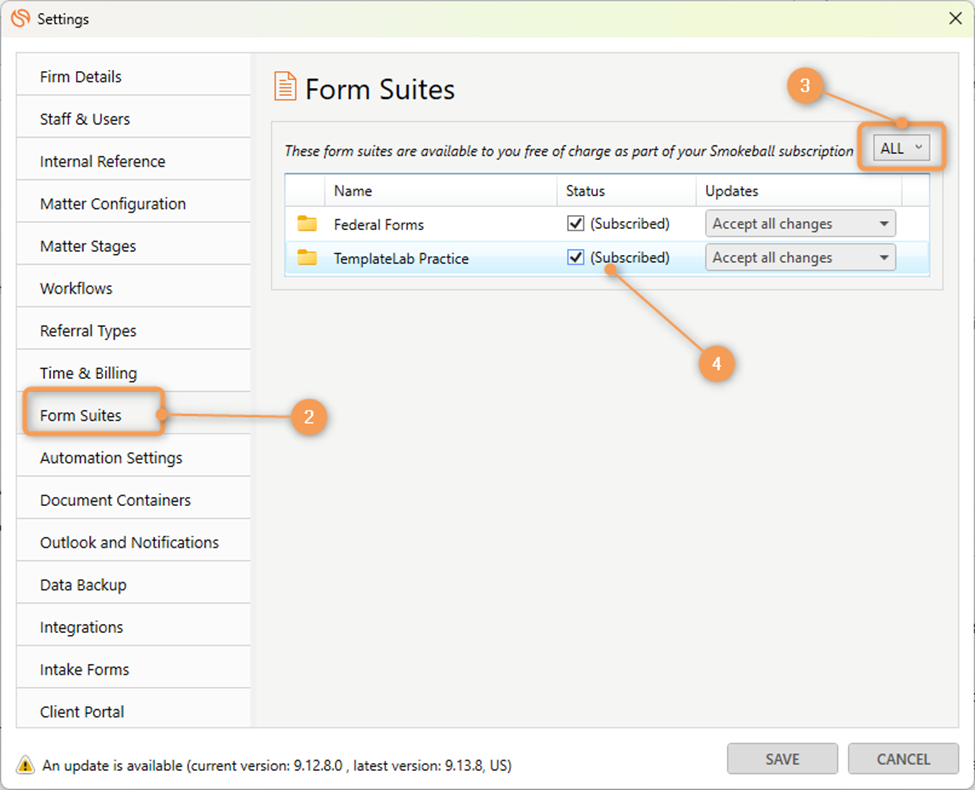 - Select the checkbox under status to Subscribe to the form suite. By default, form suite Updates will be set to Accept All Changes.