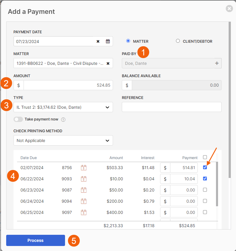 - Note: You will have to fill out the Matter or Debtor and Paid By fields if using either of these options.