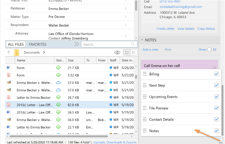 When a contact is selected in Matter Details, the Contact Details Widget gives additional information about the contact without clicking into the contact. You can even create letter or copy the details (vcard) to use elsewhere. You can also right click on specific items in the contact card (home phone, address, etc.) and you will be given the option to copy just that detail.