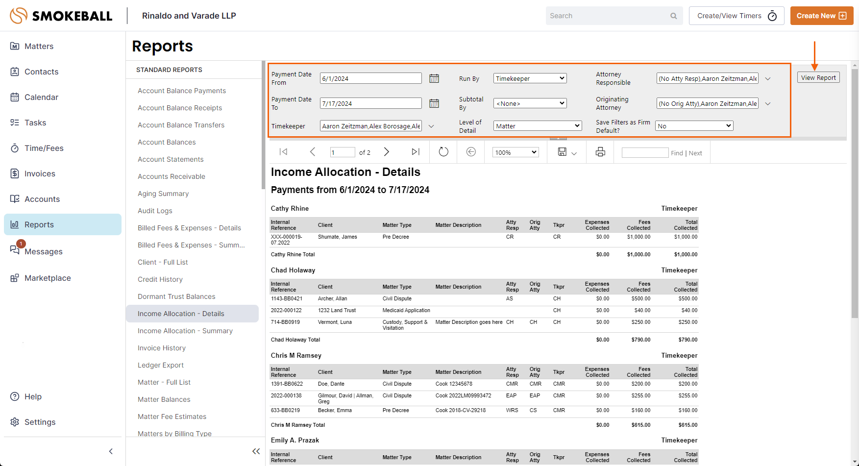 - Choose Run By, Subtotal By, Attorney Responsible, Originating Attorney, Timekeeper, and Level of Detail options if you are generating an Income Allocation - Details report.Â