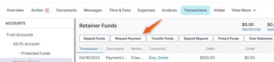 - Navigate to the Transactions tab within a matter and select your trust account or operating retainer account.Â