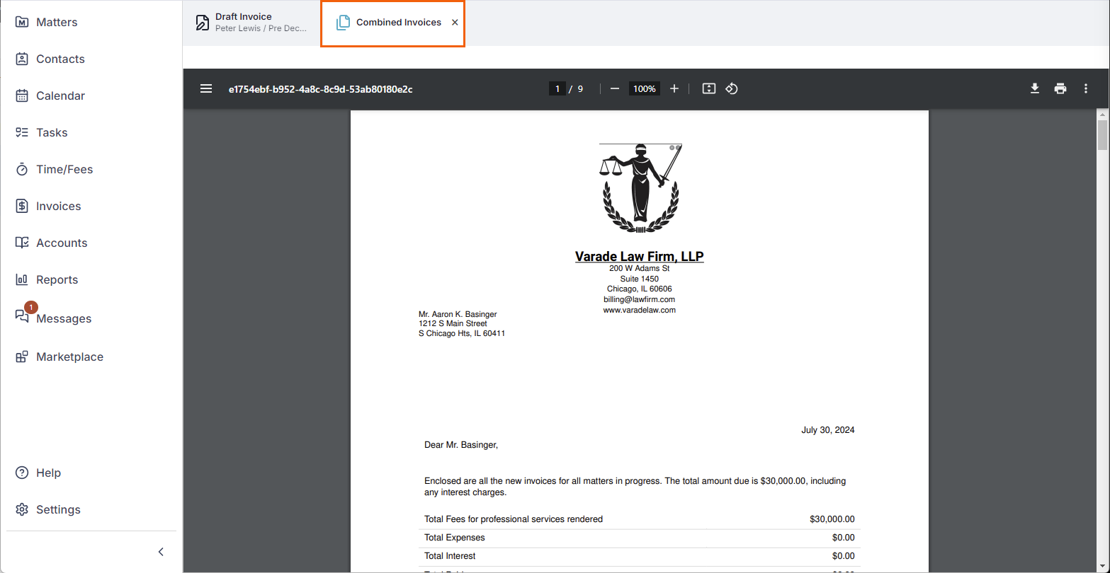 If you have a client who is retained for multiple matters and wishes for a centralized invoice that summarizes everything they owe, it is possible to add a standardized cover letter for this purpose.